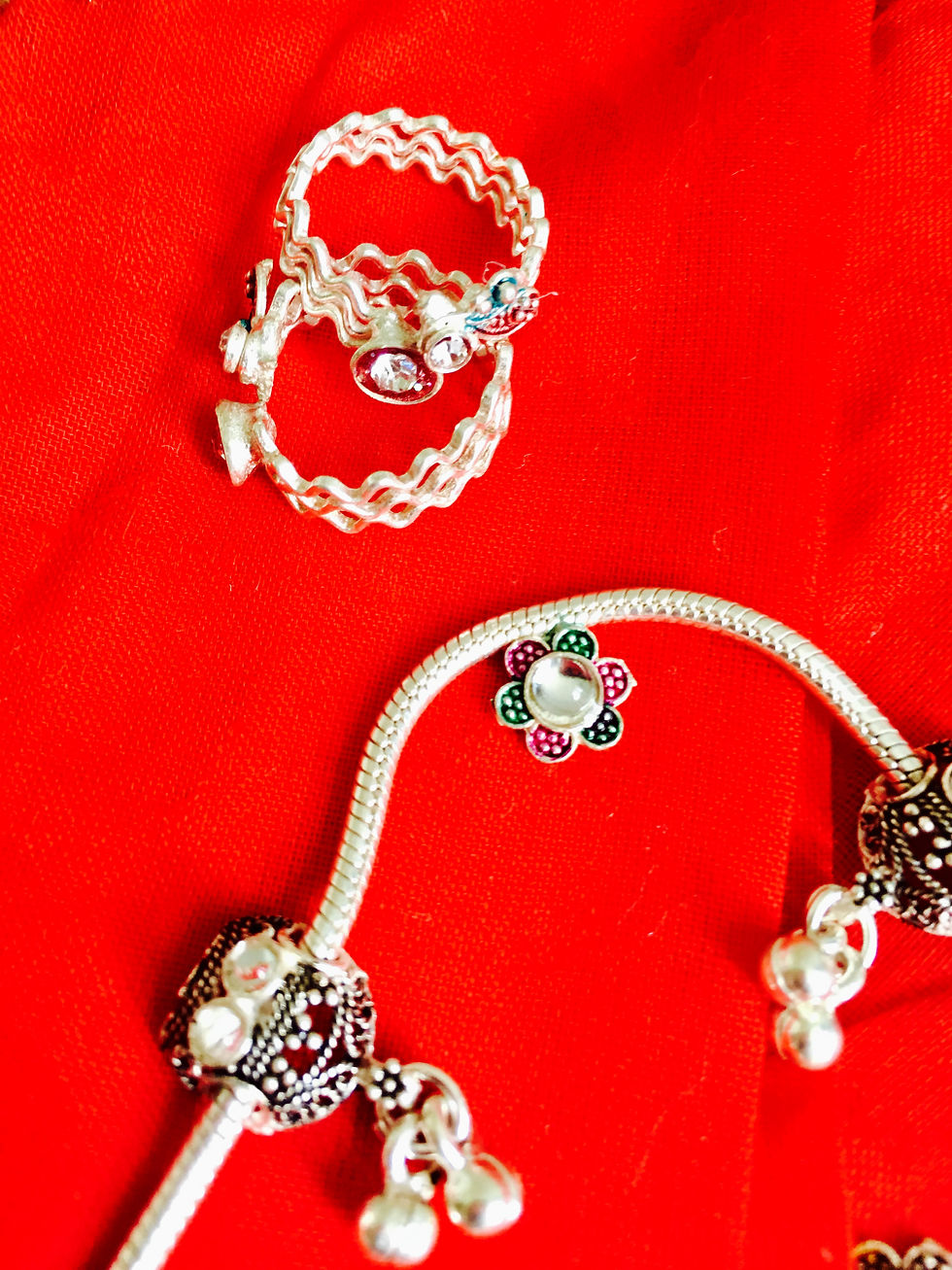 I will also wear green stone ring with crystals, silver anklets with cute owls, toe rings and a bangle.